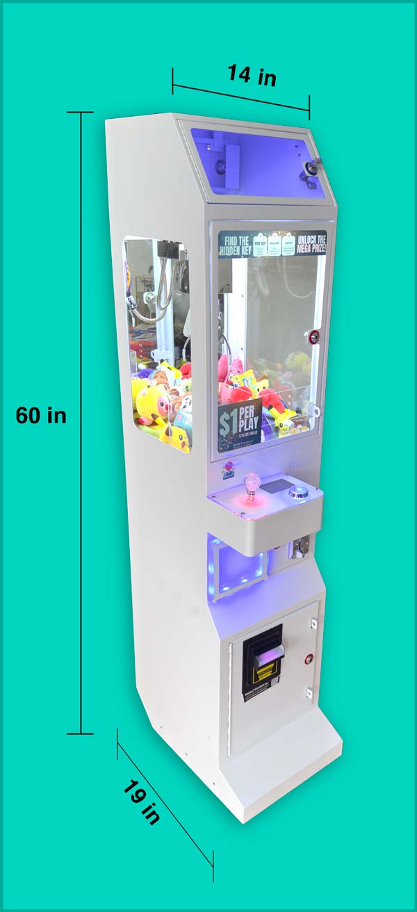 Forget your 1980s claw that was the size of a small closet. Our claw machines are just 14 inches wide by 19 inches deep and 5 feet tall.